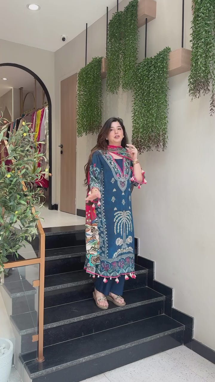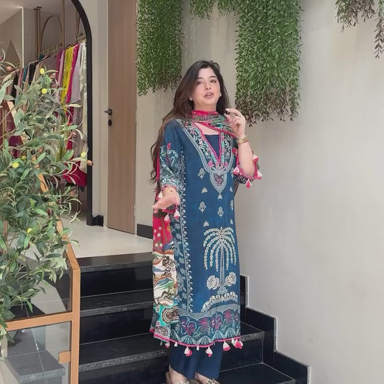 tep into elegance with this beautifully crafted navy blue embroidered suit set. The kurta features intricate white and multicolor thread embroidery, highlighted with a stunning palm-tree inspired motif on the front and floral borders at the hem. Paired with matching straight-fit trousers and a vibrant multicolor printed dupatta, this outfit blends traditional charm with modern vibrance.Perfect for casual outings, festive gatherings, or day events, this ensemble delivers comfort and style effortlessly.