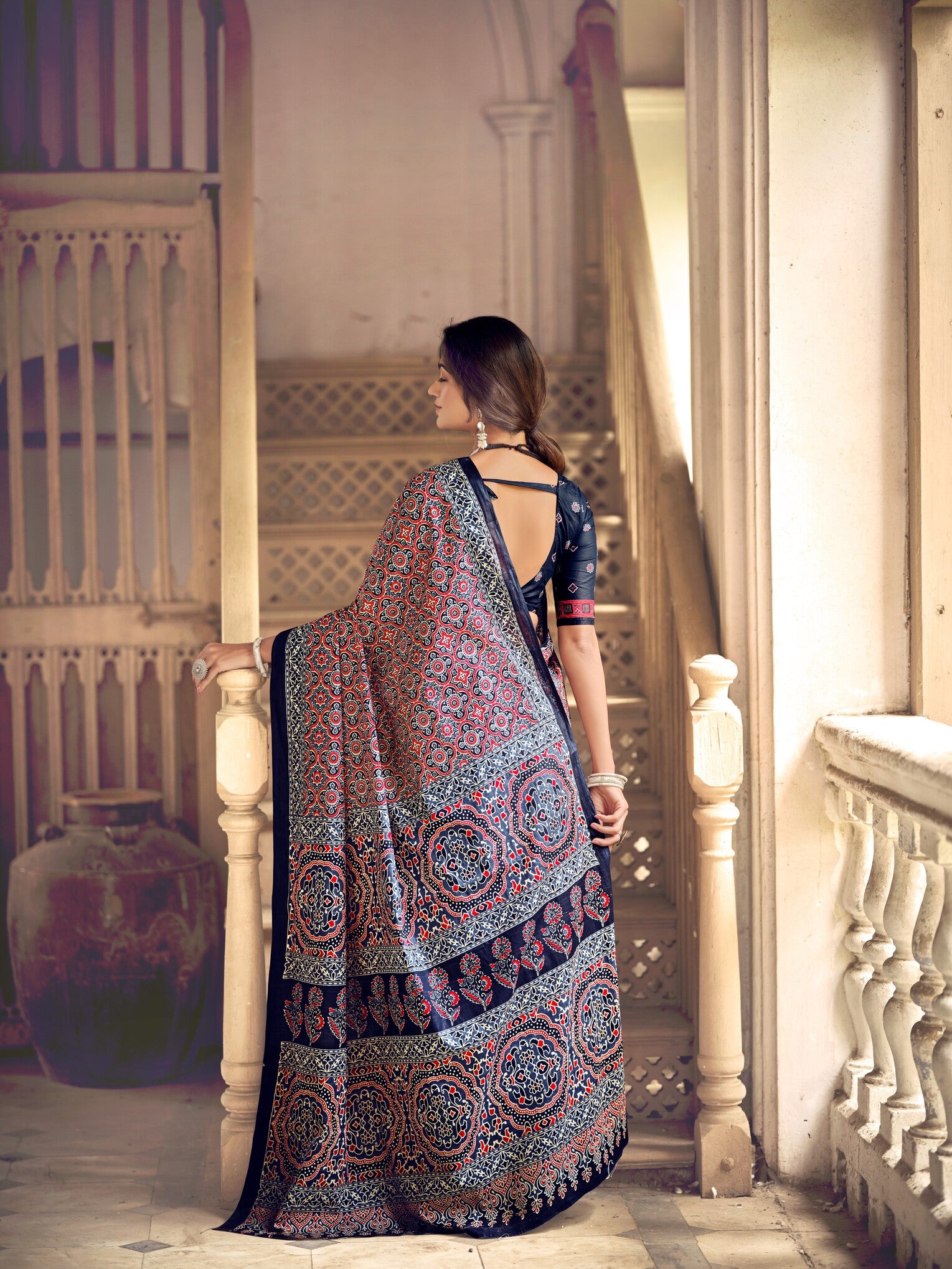 Dharma - Ajrakh Print Pure Mul Cotton Saree With Blouse