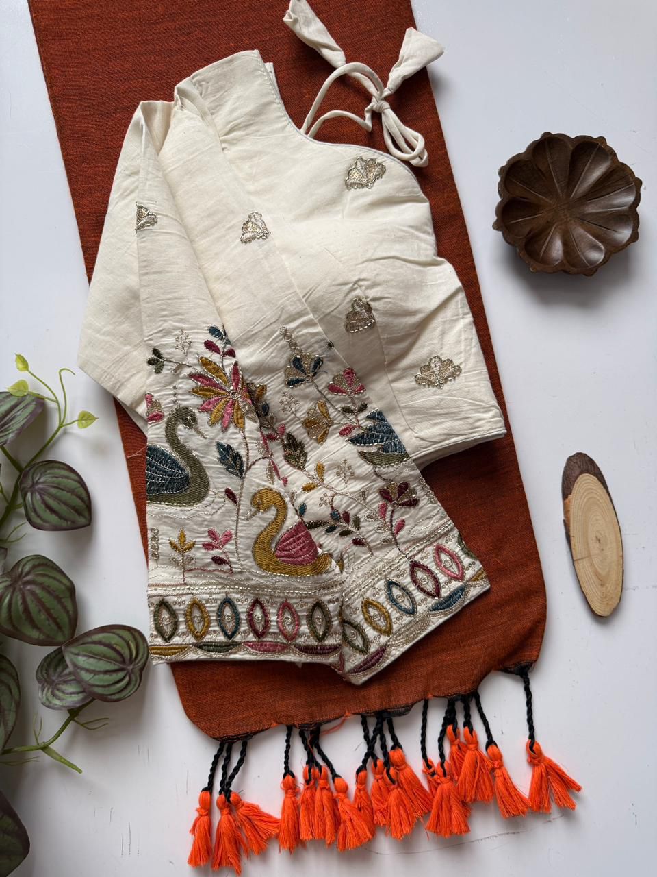 - Dharma Exclusive - Orange Handloom Cotton Saree With Havy Embroidery Stitched Blouse