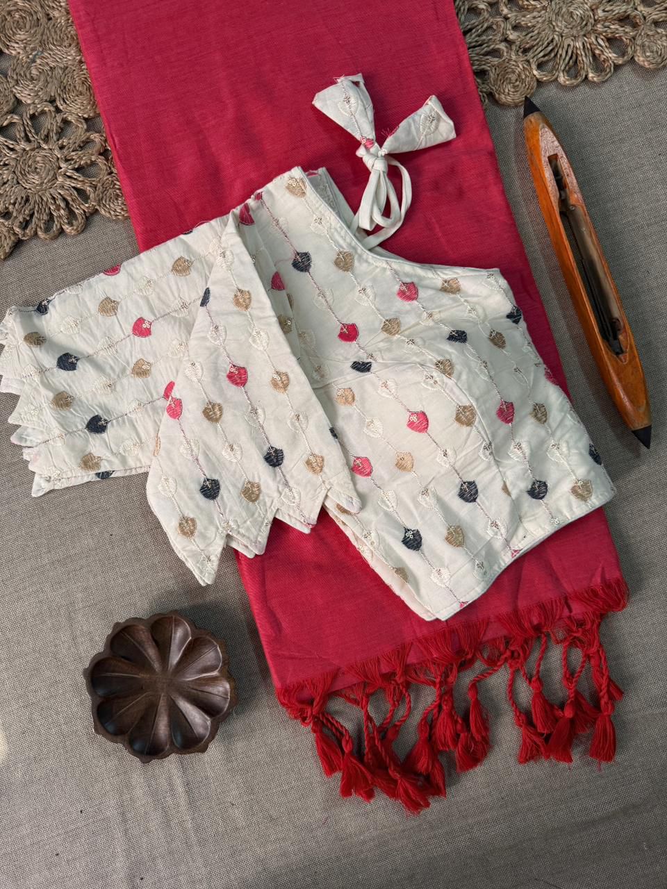 Dharma Exclusive - Pink Handloom Cotton Saree With Havy Embroidery Stitched Blouse