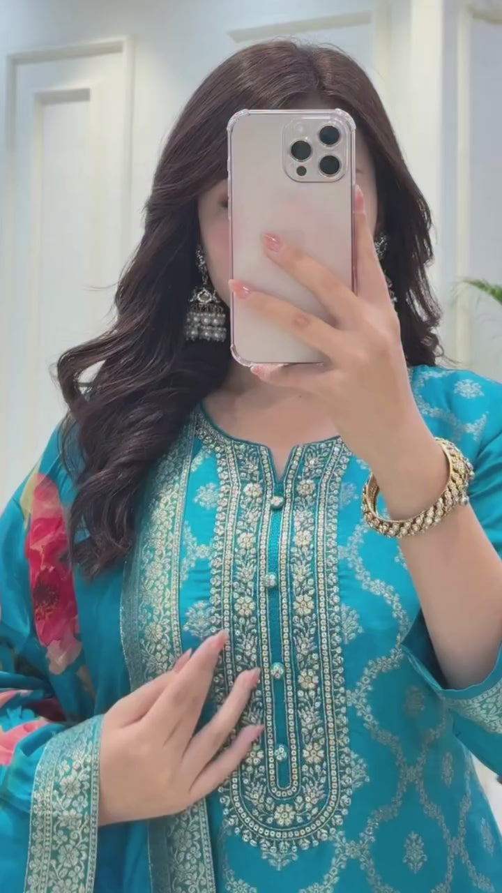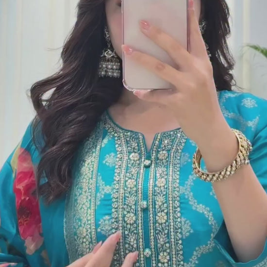 Experience Timeless Elegance With This Pure Banarasi Silk Suit Set, Showcasing Intricate Jequard Zari Weaving That Highlights Expert Craftsmanship. The Luxurious Fabric Offers a Rich Texture and Sheen, While the Digitally Printed Dupatta Adds a Contemporary Touch to the Traditional Ensemble. Perfect for Formal Occasions, This Suit Set Blends Heritage Artistry With Modern Design for a Distinguished Look.