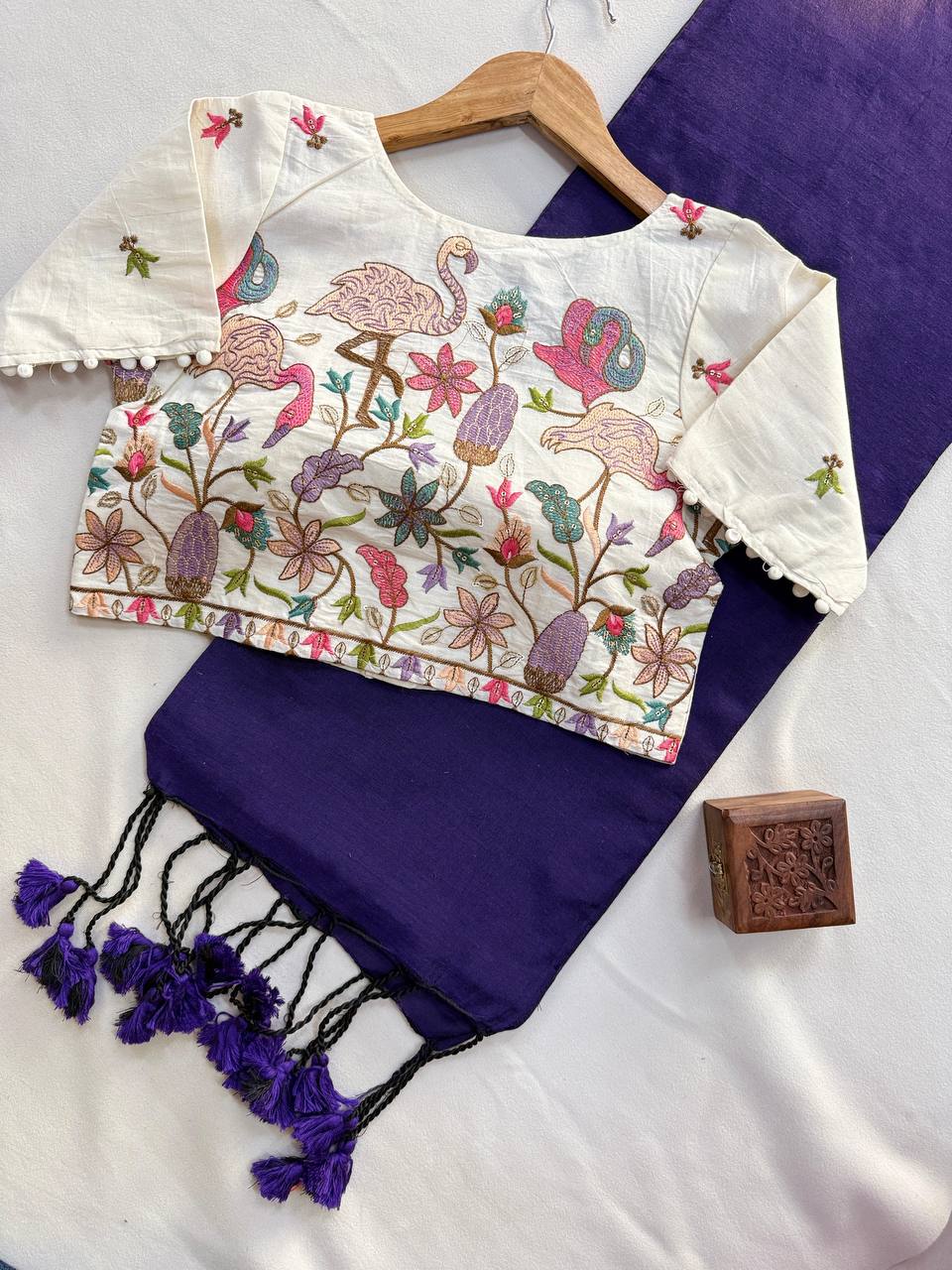 - Navy Blue Pure Handloom Cotton Saree With Stitched Embroidery Blouse