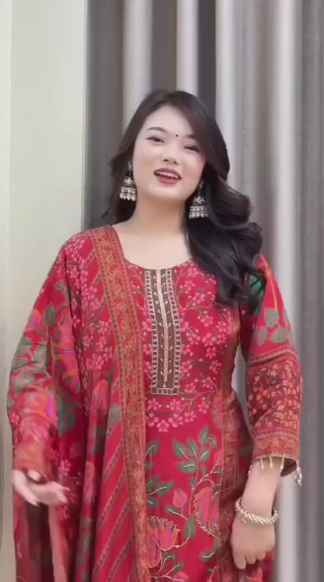 PREMIUM DESIGNER RED MUSLIN SUIT SET