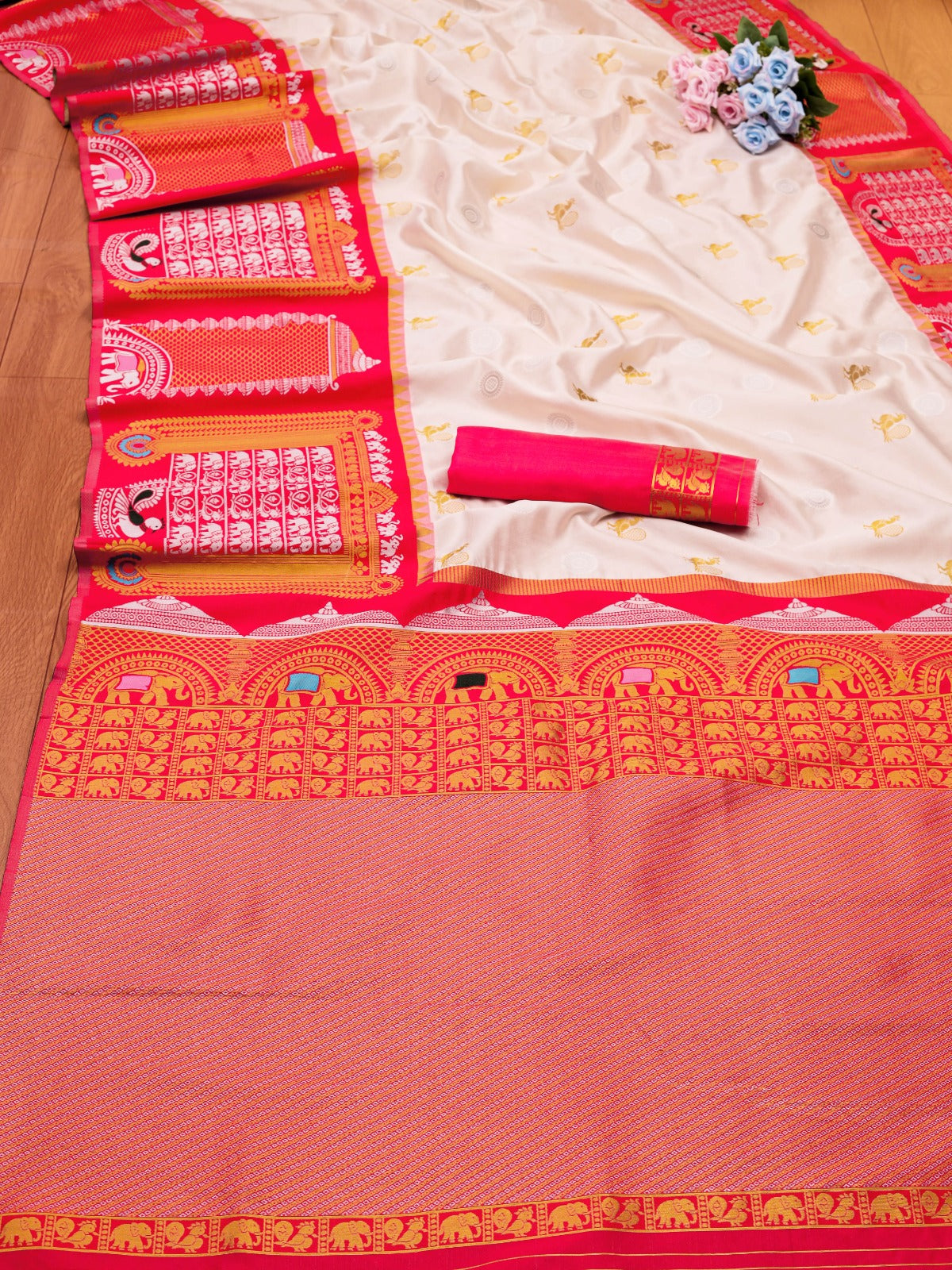 - White & Red Soft Banarasi Silk Saree With Zari Weaving Work