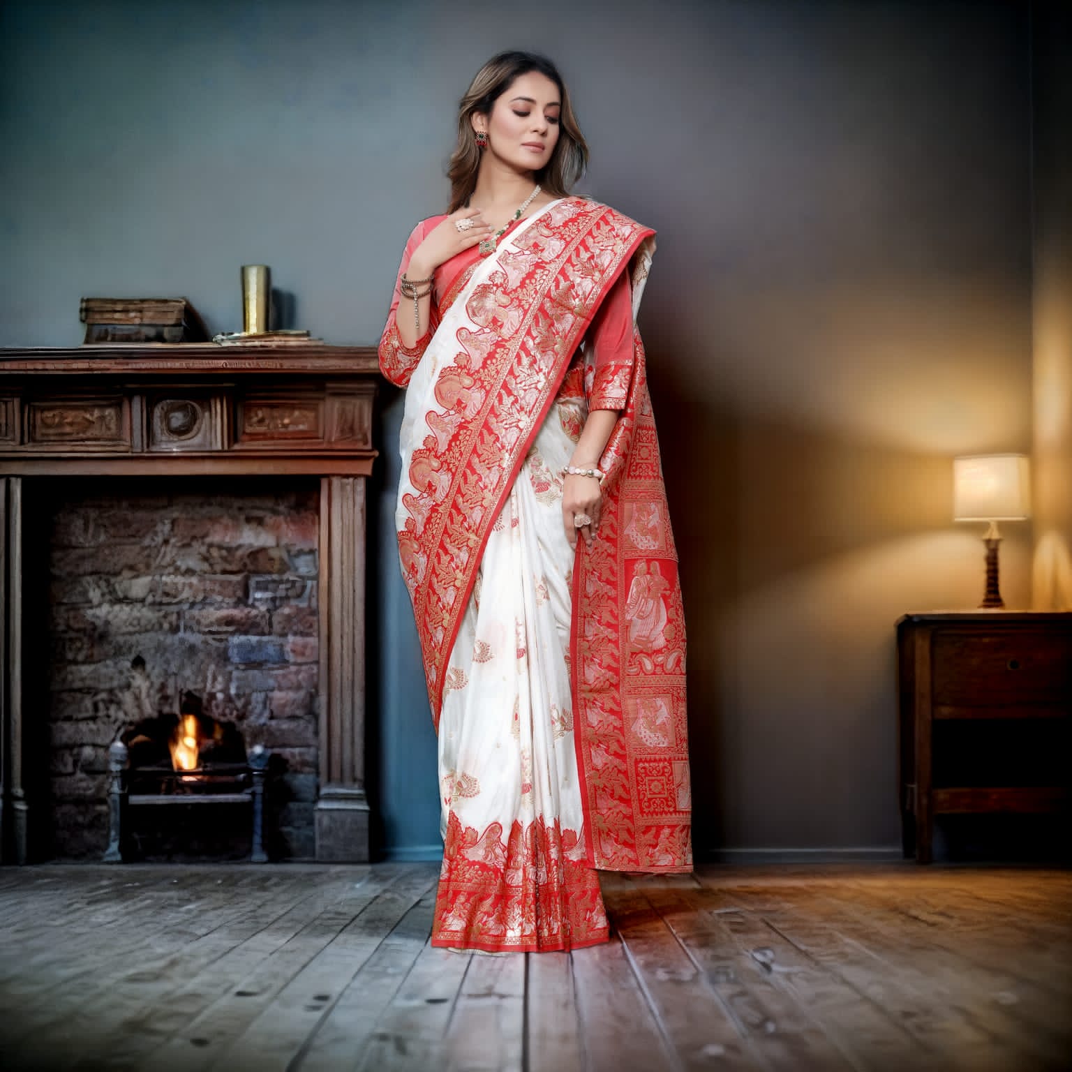 - White & Red Soft Banarasi Silk Saree With Zari Weaving Work